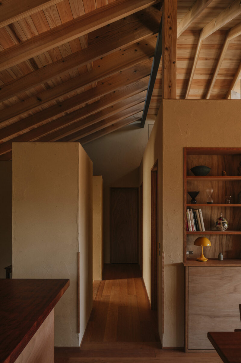力強い構造の現れた天井と、素朴な塗壁との空間
