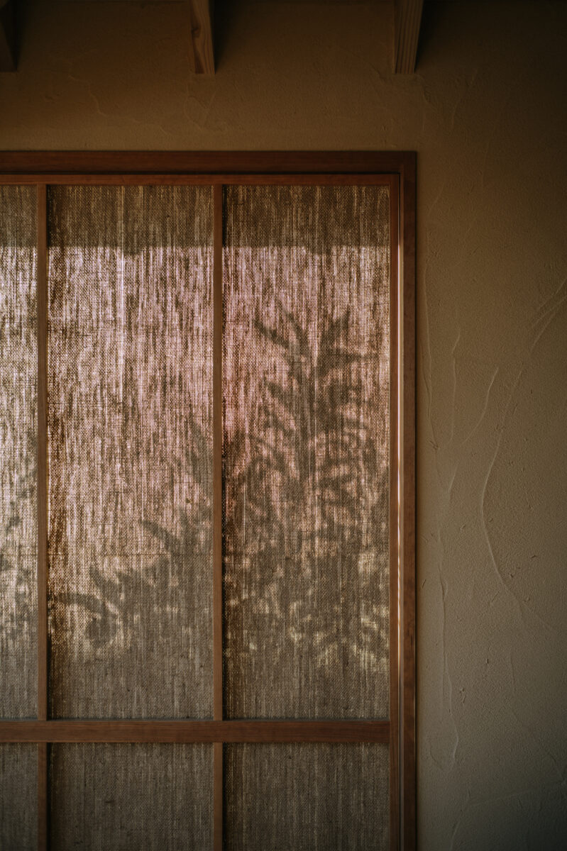 「入母屋」の屋根は、空からの光と遠くの山並みを切り取り柔らかい光が差し込みます