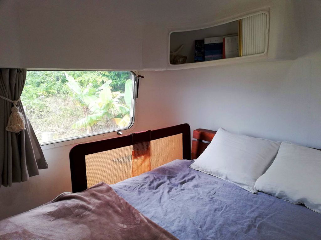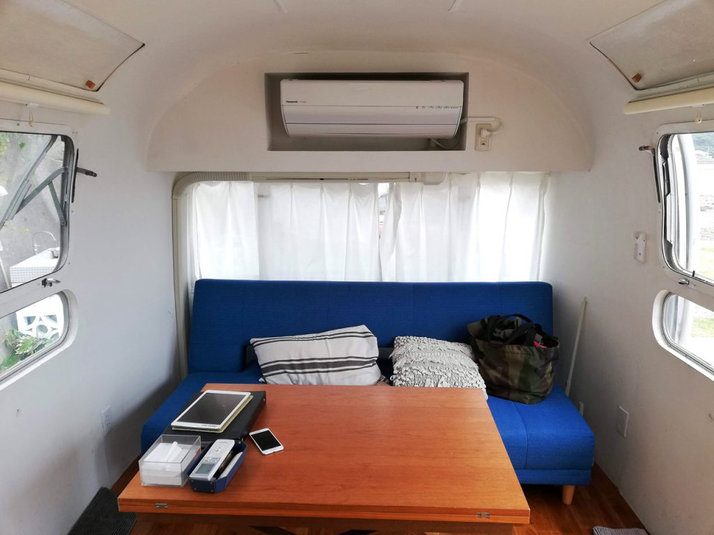 アルミ材でできた流線型のボディは航空機に着想を得てデザインされたもの。空気抵抗が少なく軽量なため、自転車でも牽引できたのだとか!中身はフルリノベーションされていて、快適に過ごせるようになっていましたよ。