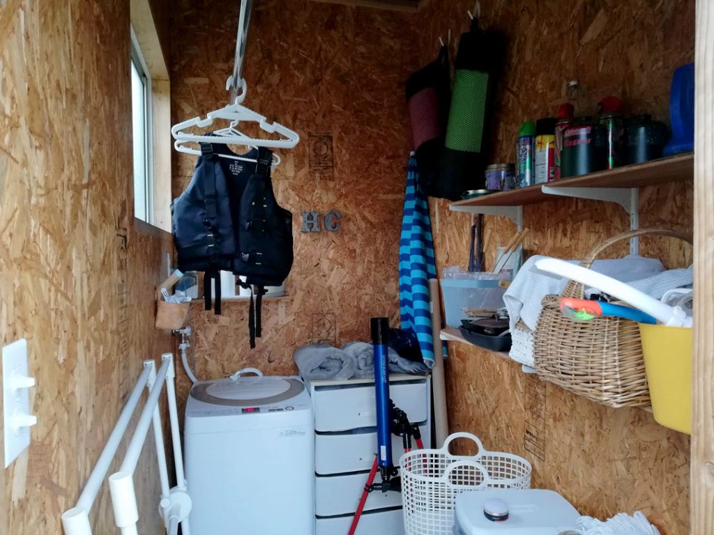 これが内部です。洗濯機のほかに、庭や海で使うレジャーアイテム、キャンプ道具などがしまわれています。これは普通のお家にも共通することですが、「家の中にあげたくないけど、屋内に入れておきたいもの」ってけっこうあります。