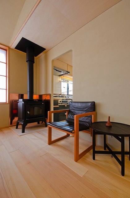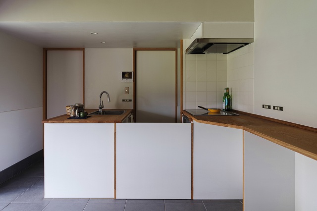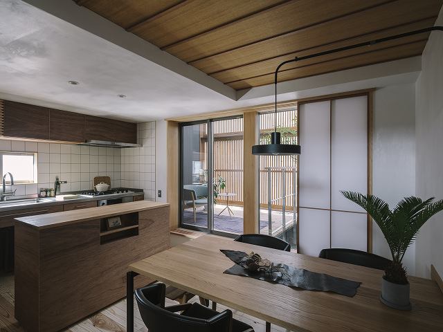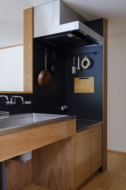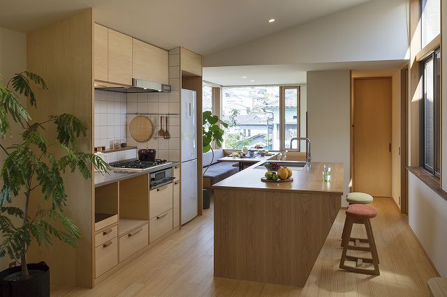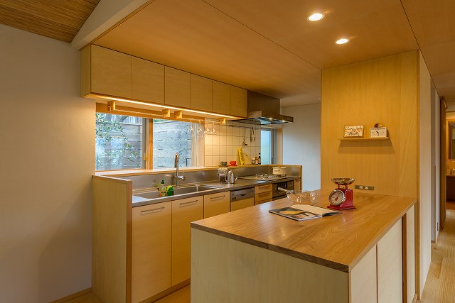 狭小地にある街中のスキップフロアの家。こちらは敷地がコンパクトだったため既製品のキッチンでは幅が合わず、オリジナルのキッチンと奥行の浅い作業台でスッキリと