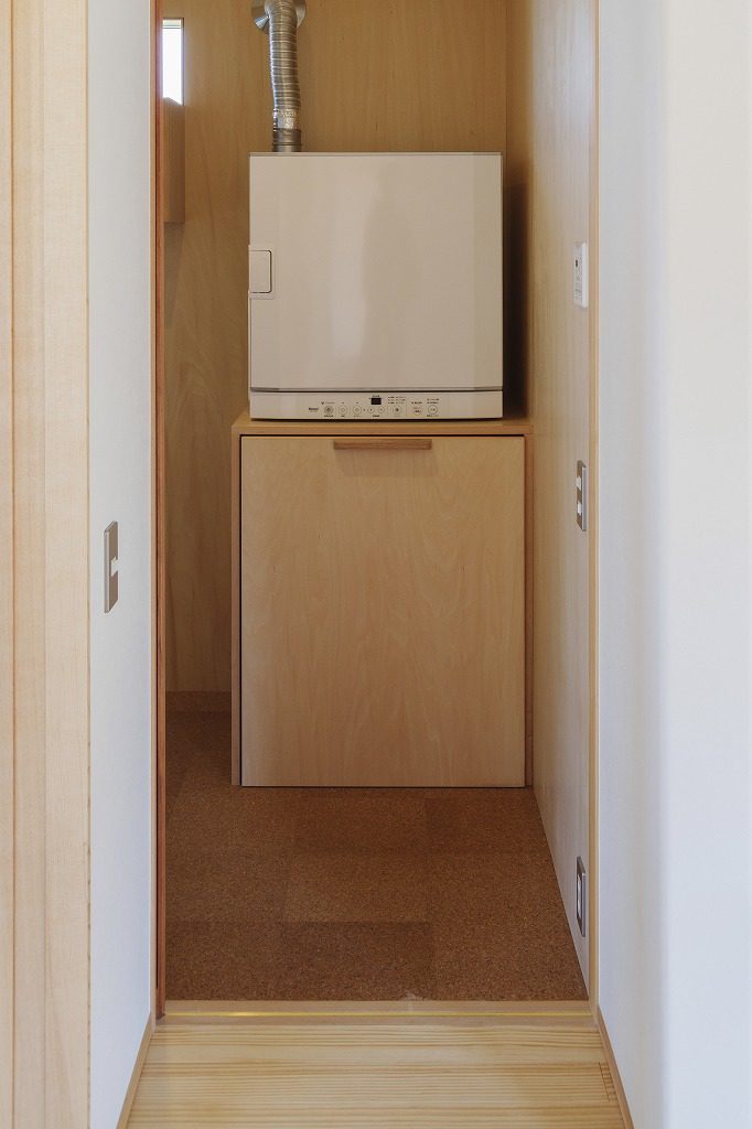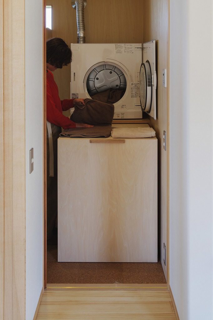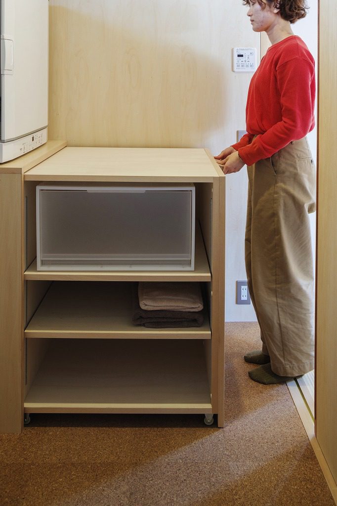 乾太くんを支える台。この台、引き出せるんです。引き出すと、作業台兼収納に早変わり。乾太くんが乾かしてくれた洗濯物を取り出しながらたたんで仕舞う。流れるように洗濯、完了です!