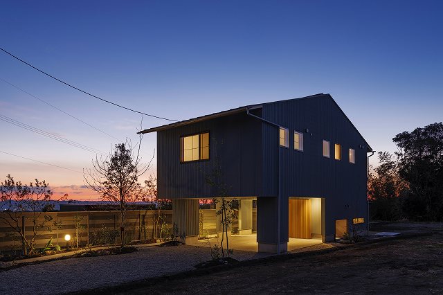中庭のある平屋のおうち。ガレージ内の暗さを和らげるために屋根に開口を設けて空からの光を入れています。