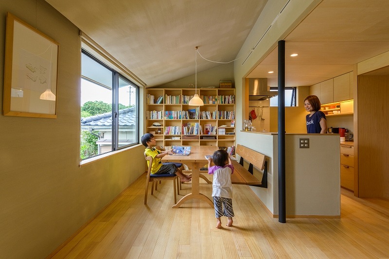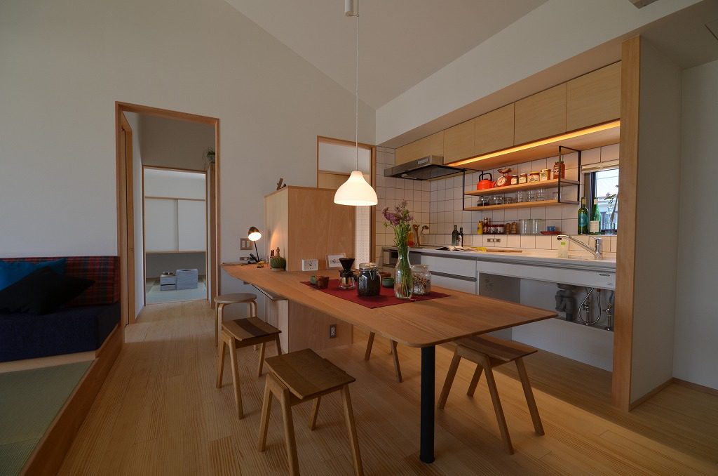 作業台を兼ねたオリジナルのダイニングテーブル。動線を考慮したオリジナルの形になっています。二つの機能を兼ねることで、コンパクトな動線になります。