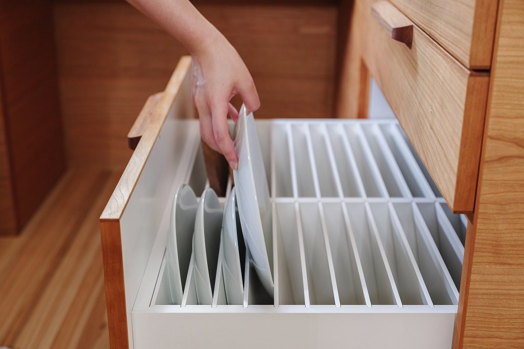 何があるか、パッと一目瞭然。スッと出せて、引き出しの開け閉めもスムーズスムーズ!な大皿入れでございました。