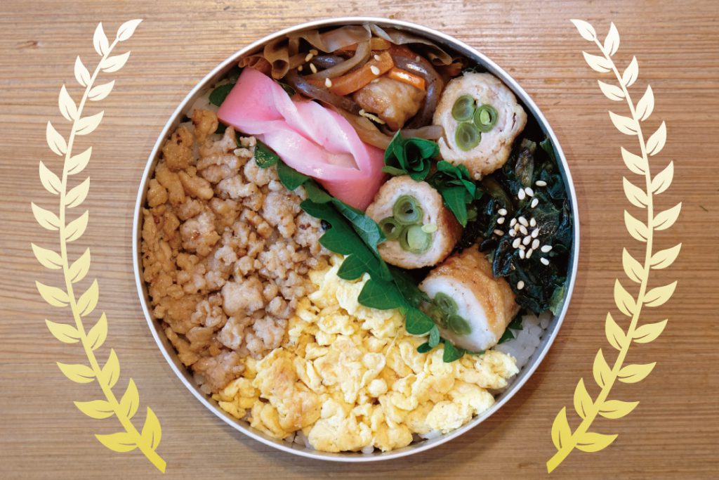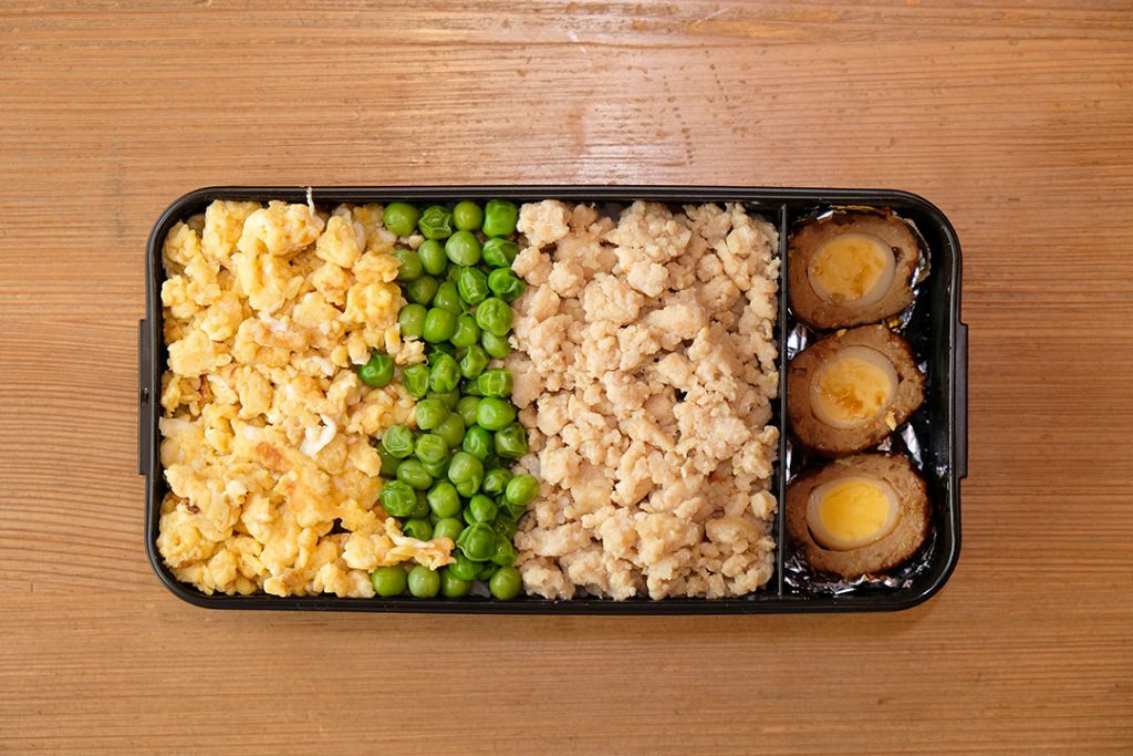 設計 小斉平さんのお弁当。気を取り直して正統派。三色そぼろ美味しそ〜。付け合せもたまごで、テーマをちゃんと汲んでくれてありがとうございます!涙