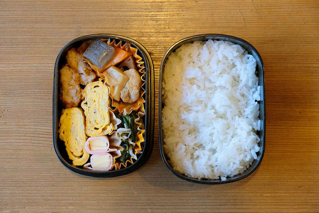 設計 織田さんのお弁当。盛り付けがきれいですね〜。卵焼きがドンドンっと美味しそう。和食のおかずに野菜も入っててバランスが取れてます。