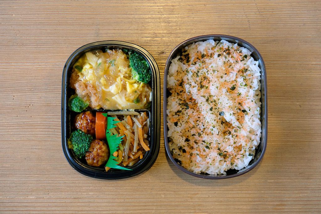 経理 福迫さんのお弁当。シメにふさわしい、見事なお弁当。まとまってますよね〜。カツの卵とじもオンリーワン!