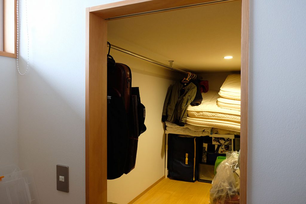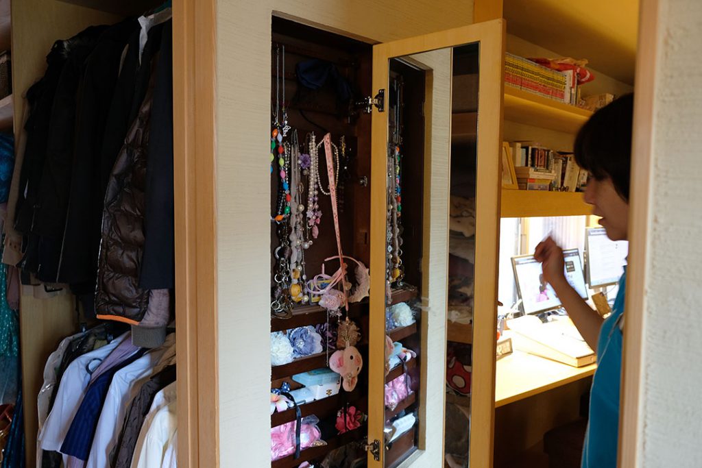 旦那様に本棚、では奥様には?こちら寝室前の壁を利用したニッチ収納。パカっと扉を開けるとジュエリーがずらり!・・・あれ?子供用?・・・そう、今は小学校3年生の娘さんのアクセサリーが並んでいます。「大きくなったらお母さんと一緒に使ってね」と話したところでした。