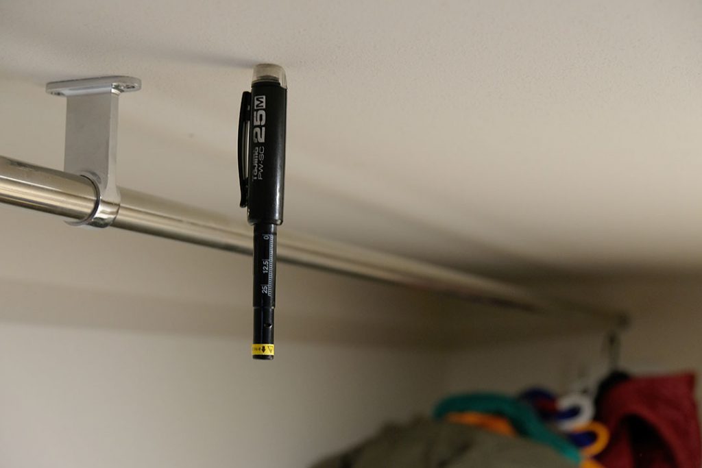 と、茶番はこれくらいにして。このペン型の道具、先端に磁石が入ってまして、下地材に打ち込まれているビスに反応して天井にくっつくんです!これをもとに、改めてハンガーパイプを固定しなおせば補修完了!