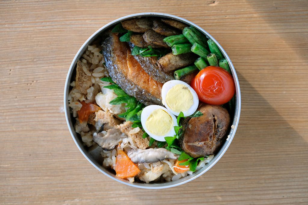 テクニカル 日置さんは男の日の丸弁当!鶏肉とネギの炊き込みご飯がギューギューに詰まってます。「あまりにも地味だったから」と、真ん中にゆで卵を持ってくる当たり、審査員の目を意識してますね。