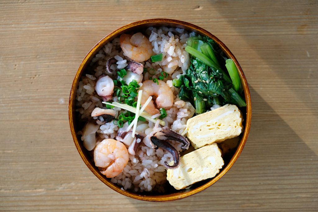 プランナー 長田さんはエビとタコの炊き込みご飯。シンプルですが、きれいにまとまってますね。「前回よりも盛り付けに気を使った」とは本人談。