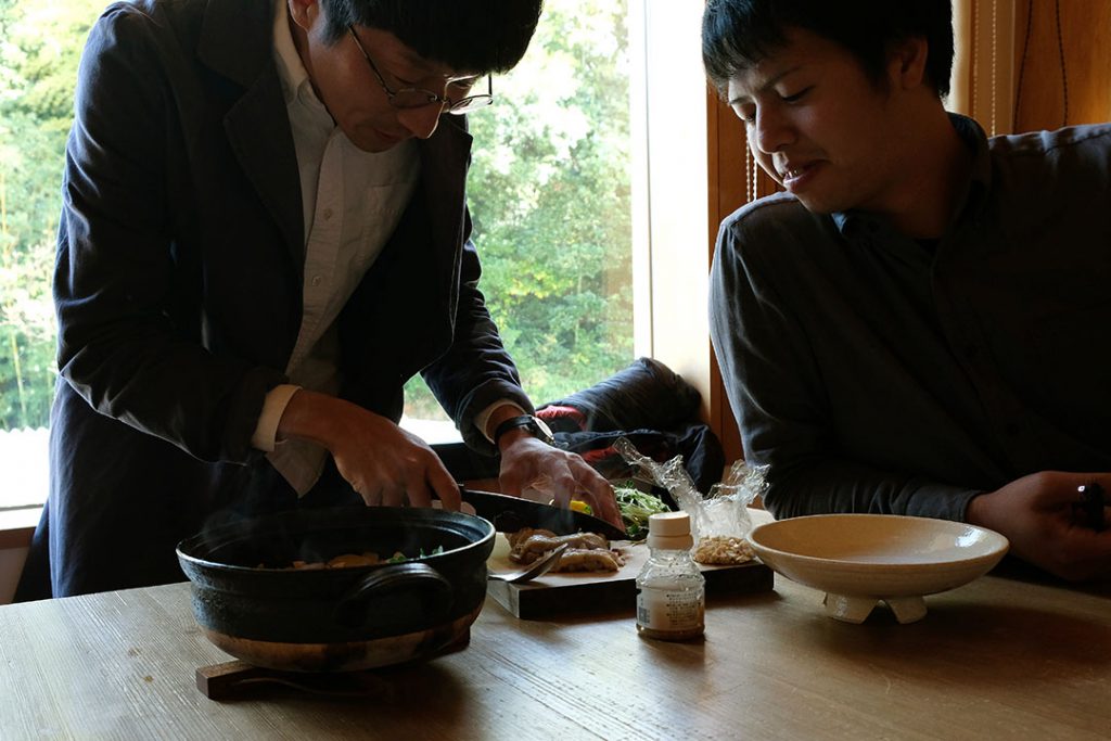 「ほら!めちゃめちゃウマそうですよ!」と炊きあがった鶏肉を切り分ける谷さん。……美味いか、美味くないかが問題じゃないんだけどね。隣で呆れている日置さん。本当に呆れています。本当に。