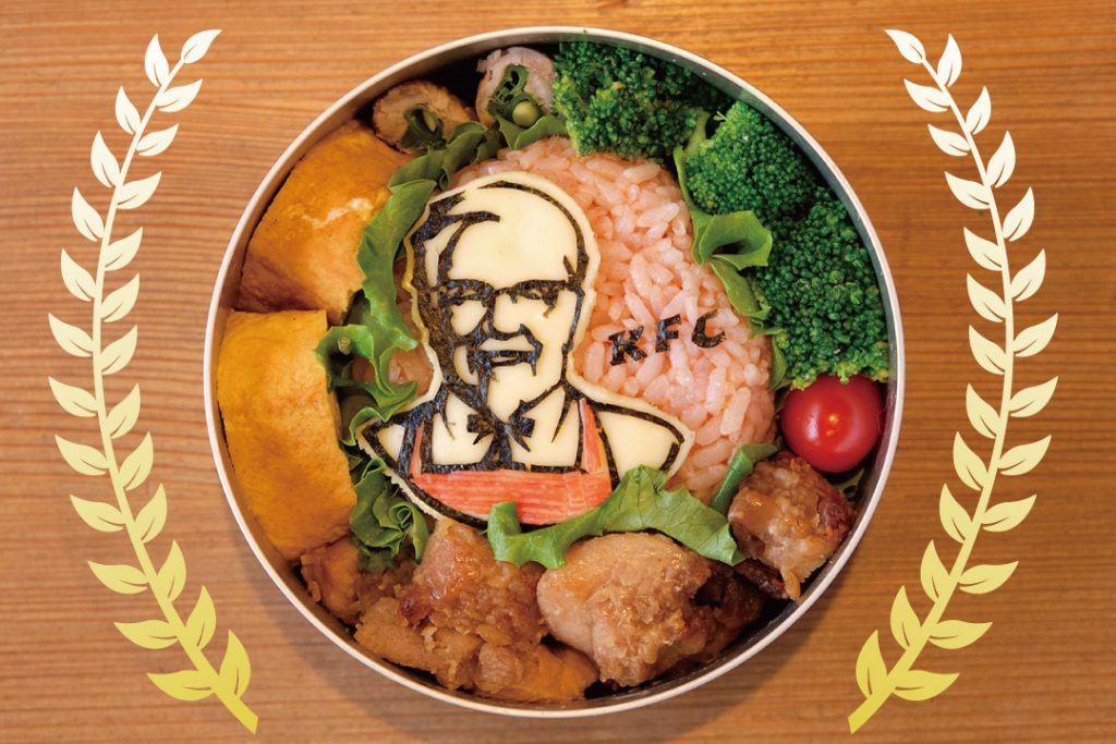 第一回大会優勝の設計・赤﨑のお弁当はこちら!海苔とチーズとカニカマで作ったカーネルおじさん!「チキン」のテーマの解釈が独特ですねー。