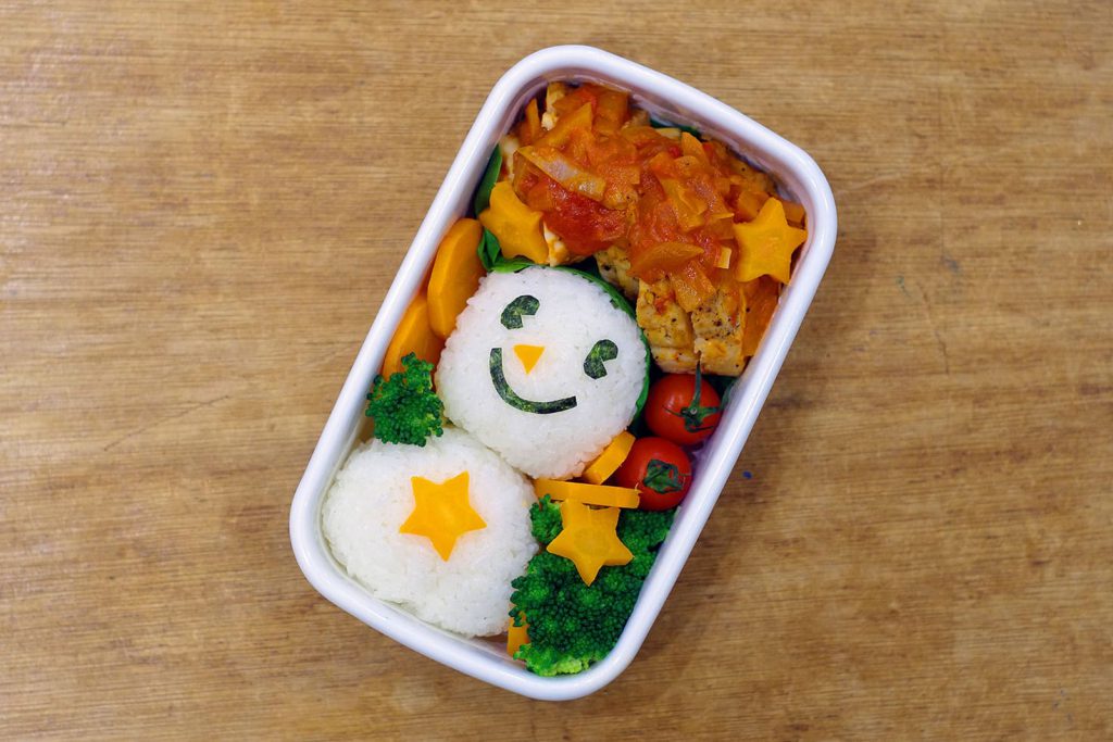 そしてわたくし!広報塚本は今回もキャラ弁。トマトソースのチキンステーキに雪だるま!だいぶ進化してきましたでしょう?星のニンジンとか頑張りましたでしょう?三十代後半のおじさんが頑張ってますよ!