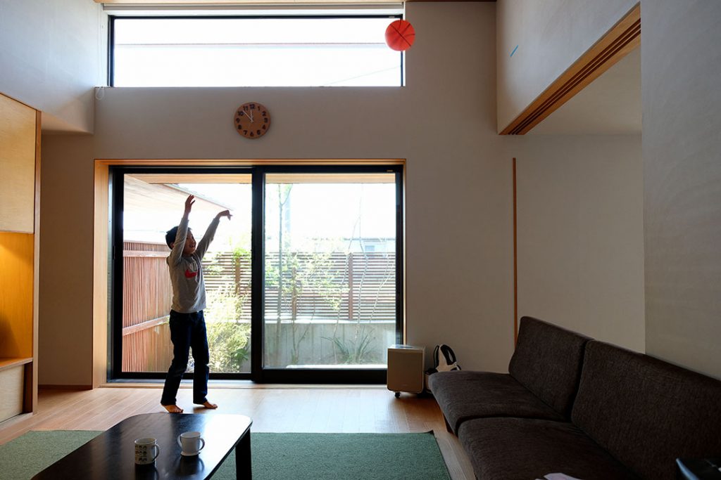 ご長男が目下、ハマっているのはバスケット。高天井のリビングの壁に向かってシュート練習に勤しみます。壁にはテープが貼られていて、それがちょうどリングの高さなんだとか。