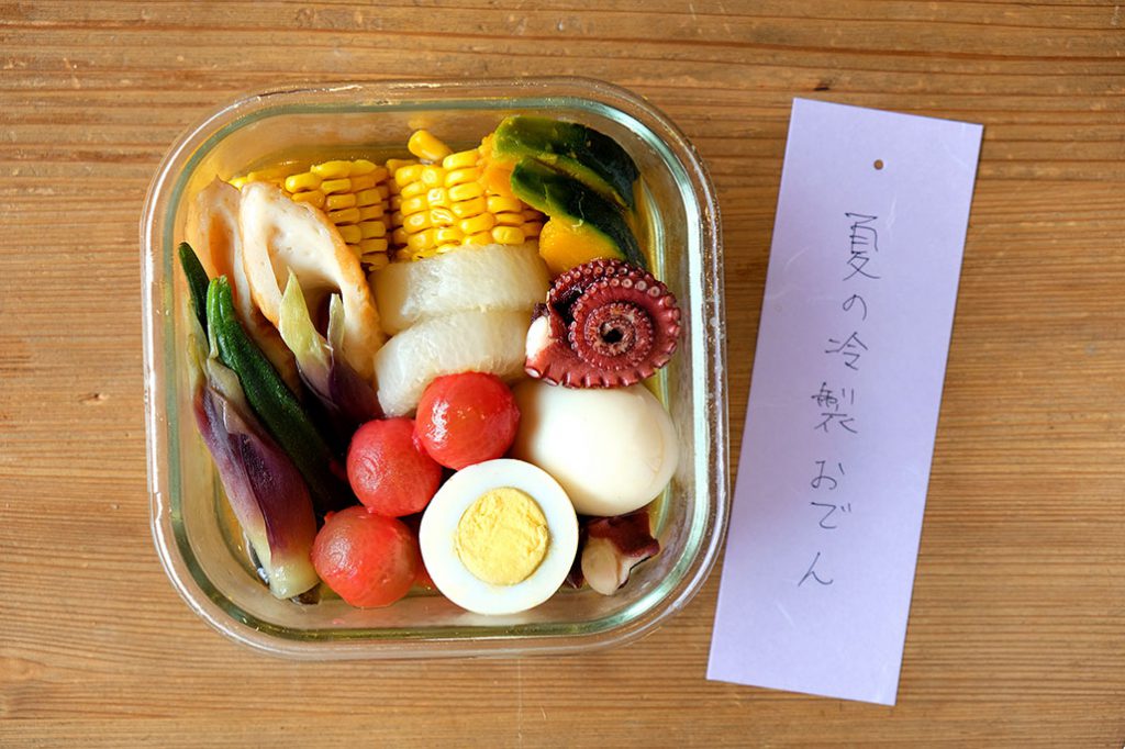 玉子や大根、ちくわといったおでんの定番に、トマトやみょうが、オクラなど夏の食材が入ってて新鮮!