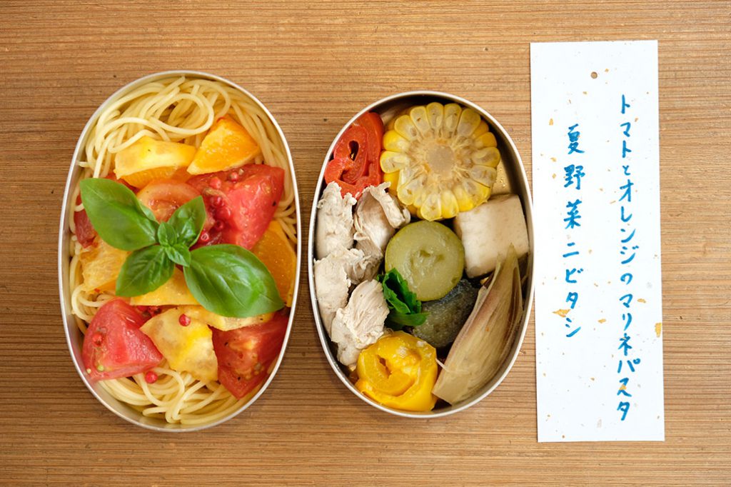 テクニカル石亀さんはまたまたオシャレなお弁当!“トマト”に“オレンジ”に“マリネ”に“パスタ”って!スマートな言葉しか並んでないな(ひがみ)