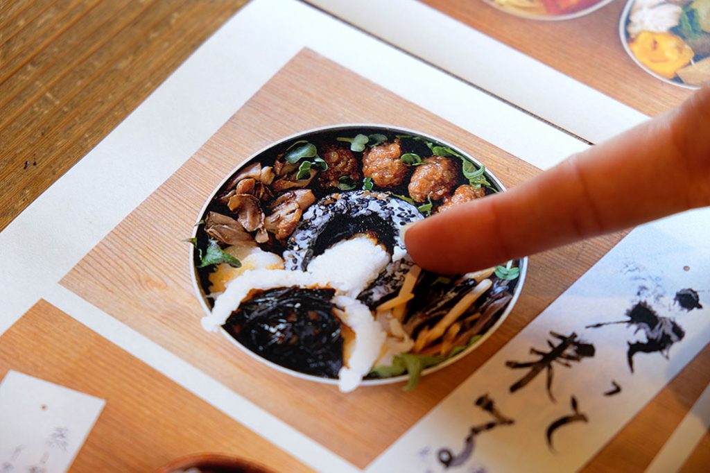 「舞茸ときくらげ、かいわれなどでオドロオドロしさを演出してます。井戸の中のドス黒い液体は“ごはんですよ”です♡」