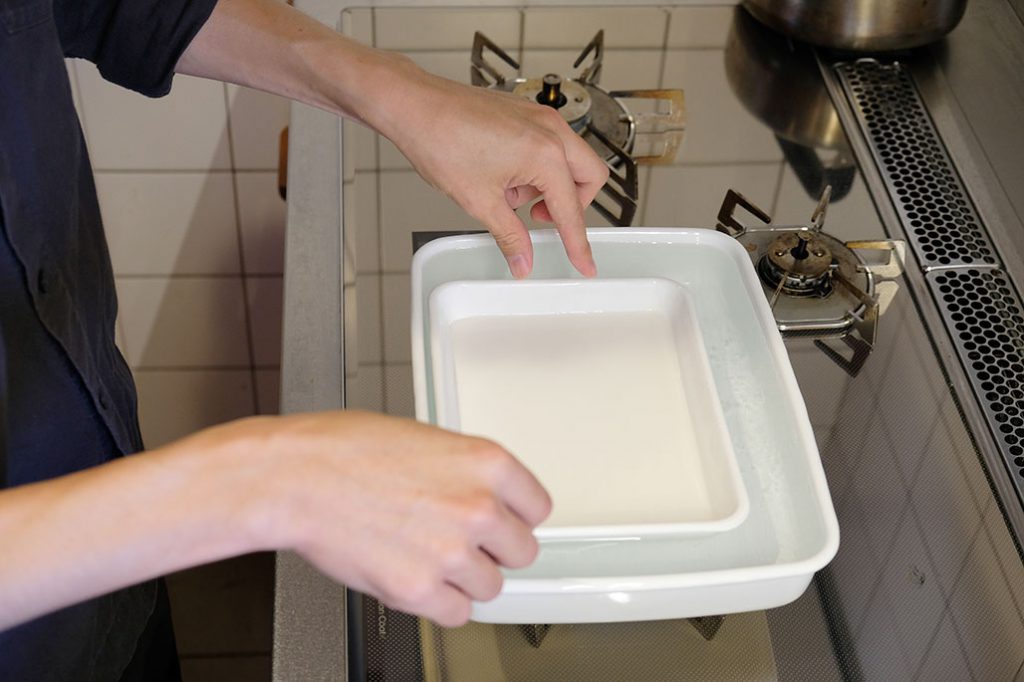 一度濾してからバットに流して薄く広げます。生春巻の皮?