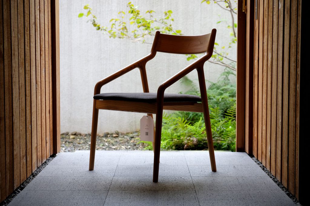 <ソスタ>は、福岡県朝倉市のシキファニチアでつくられているダイニングチェア。横から見たときのデザインが特徴的で、脚から背にかけてほんの少しだけアームが前に出ており、座ったときにちょこんと肘をかけられます。また、脚やアーム、背もたれの部分などに、小さな工房ならではの、木工の細やかでていねいな仕事が施されています。村澤氏曰く「丸いダイニングテーブルとの相性がいい」とのこと。