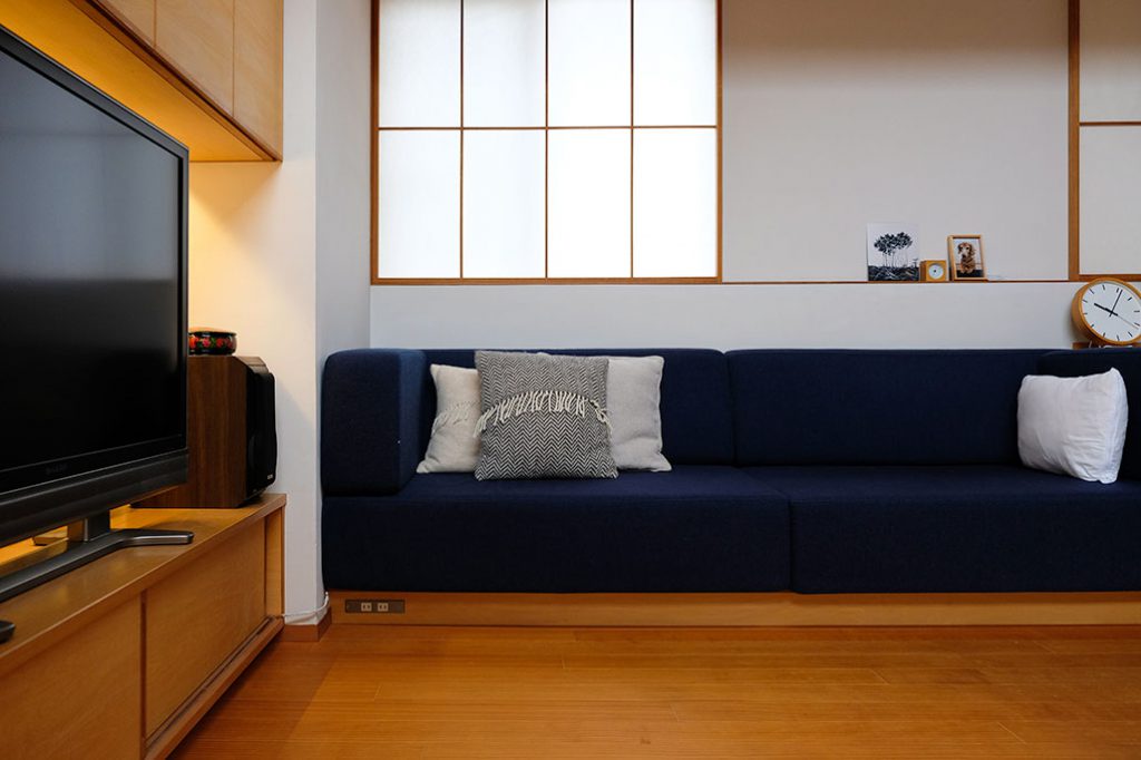 その中庭に隣接してリビングがあり、リビングにはお二人のお気に入りの造作ソファがあります。座面の広さ、高さ、クッションの弾力、カバーの色まで全てオリジナルのソファです。
