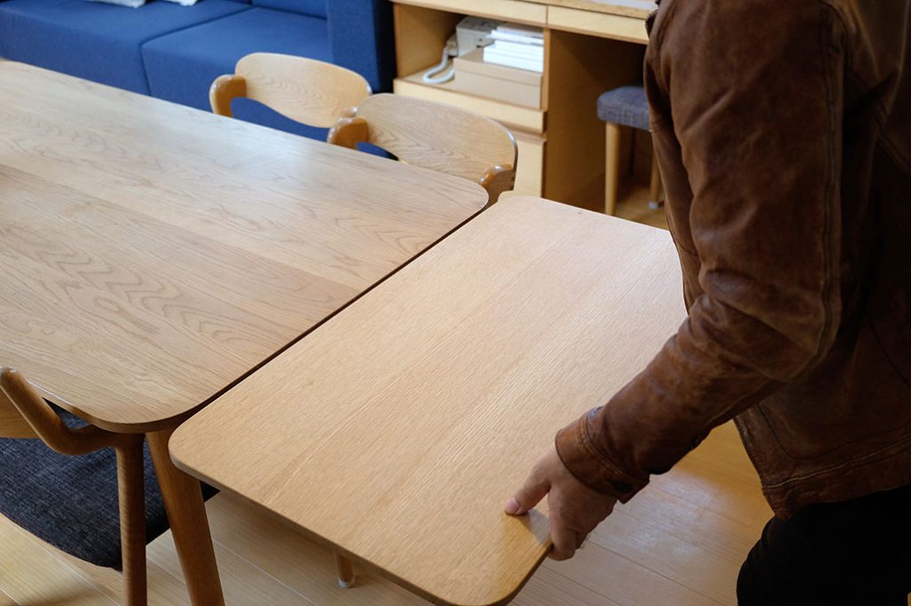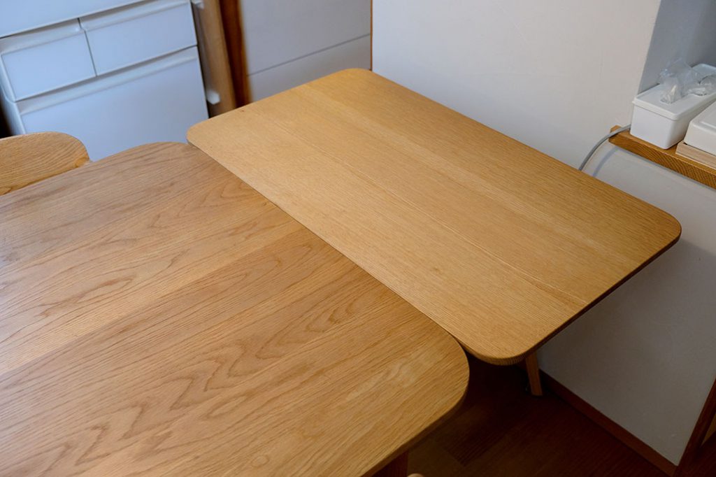 もう1つはダイニングテーブルのお話。Uさまは4人がけのダイニングテーブルをお使いなのですが、来客時などは少し手狭に。どうにかならないか?という相談を受け、弊社で制作したのが、現在お使いのテーブルに繋げられるサイドテーブルです。