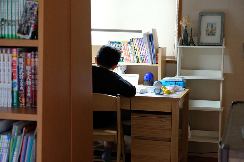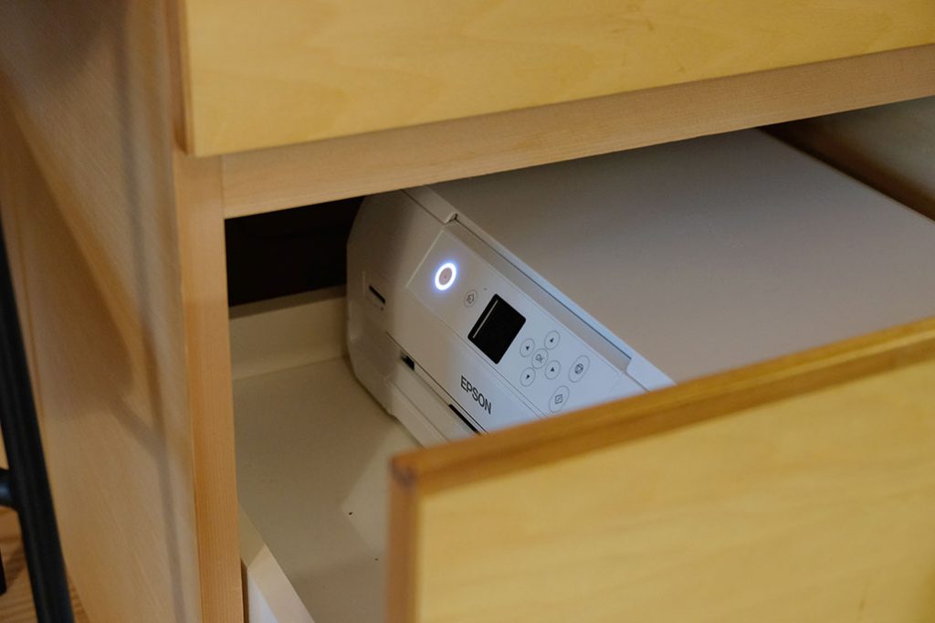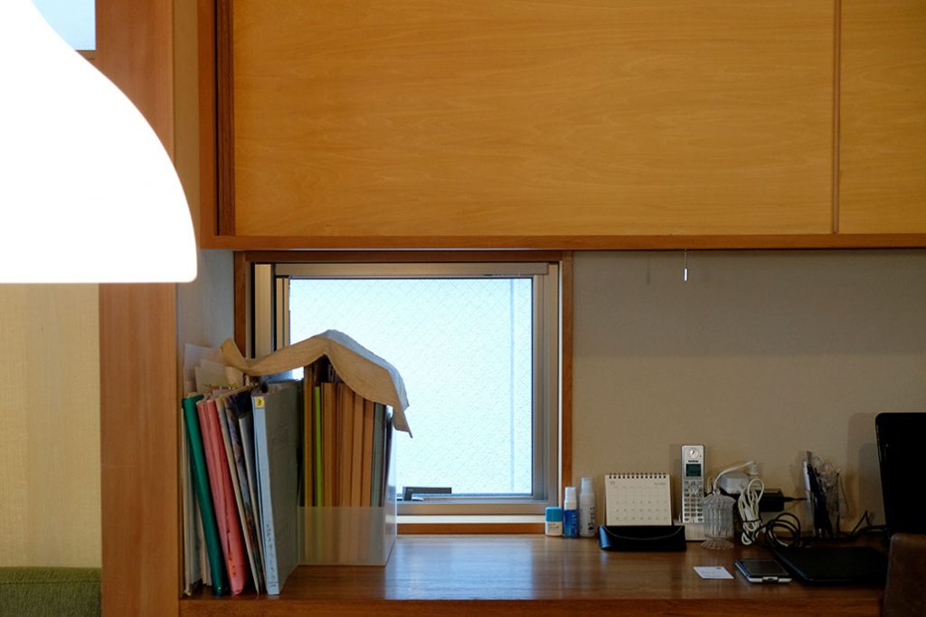 「お家がコンパクトな分、色んな所に工夫して収納を付けてくれました。和室には布団をしまえる深い押入れ。デスクには本棚とプリンター用の収納を作ってもらい、どちらも隠したかったので扉をつけてもらいました」