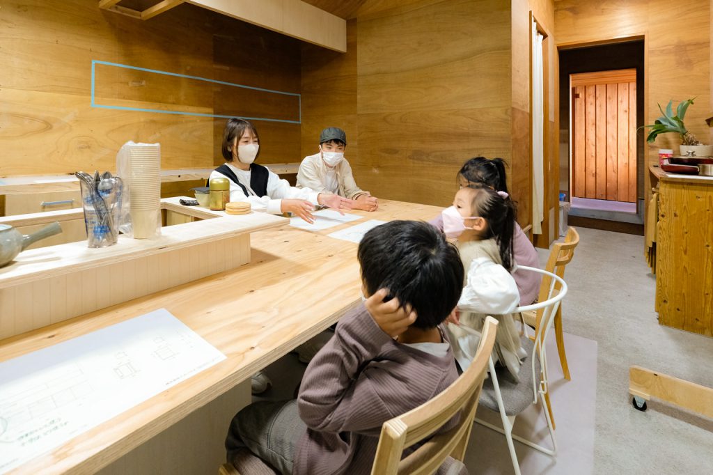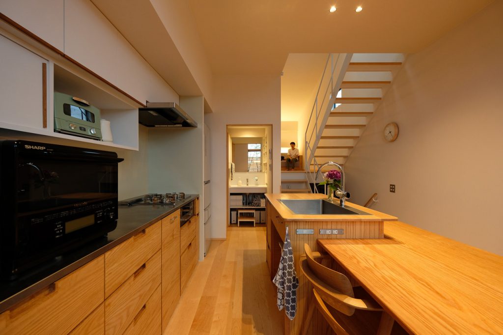 シンク周りのキッチンカウンターは、木材の“箱もの”感をなくすために、カウンターが少し出るデザインにしています。奥さまが検証した結果、この部分が干渉して子どもたちの顔が見えづらいということがわかりました。そのため実際の建築ではカウンターの出かたを少し抑えています。