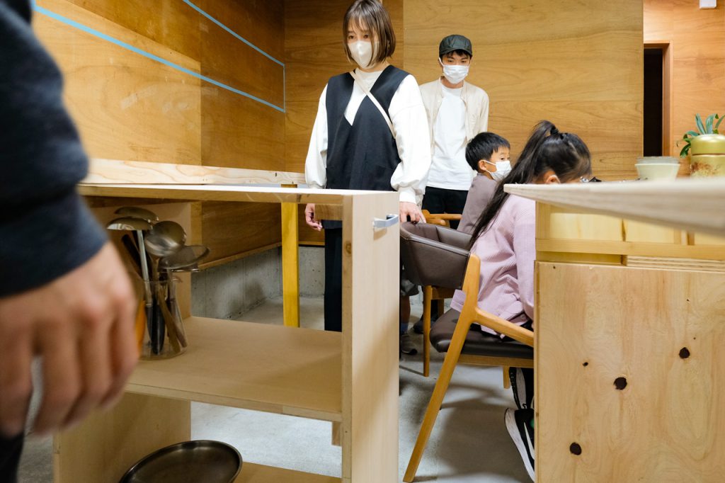 実際のシンク周りに置くであろう小物類を準備して、より暮らしに近い状態で検証していただきました。奥さまは、自身が座ったとき、自身が立っているときのお子さんの見えかたなど、さまざまな角度と場所からじっくりと検証されていました。
