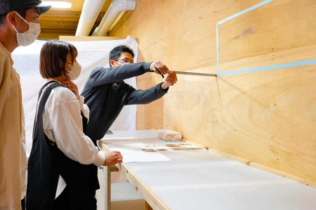 シンクの後ろには収納棚を設置することになっていたので、テープで棚の縦幅を作りスケールで奥行きの説明などさせていただきました。