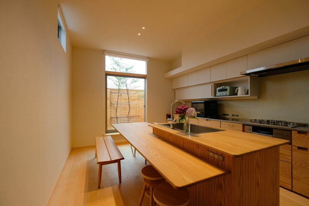 完成したKさま邸を訪れた際、ダイニングテーブルで勉強中のお子さまの横で、奥さまがお料理をされていました。このキッチンとダイニングスペースが家族の集う場所として、暮らしの中心となっており大変嬉しく思いました。