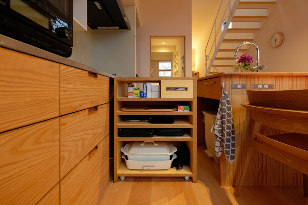 そしてもう一つのご提案が可動式の「ワゴン」です。5人家族のためダイニングテーブルを大きくとり、材料を混ぜるなどの作業スペースは、シンク横に必要最小限の広さで設計しています。