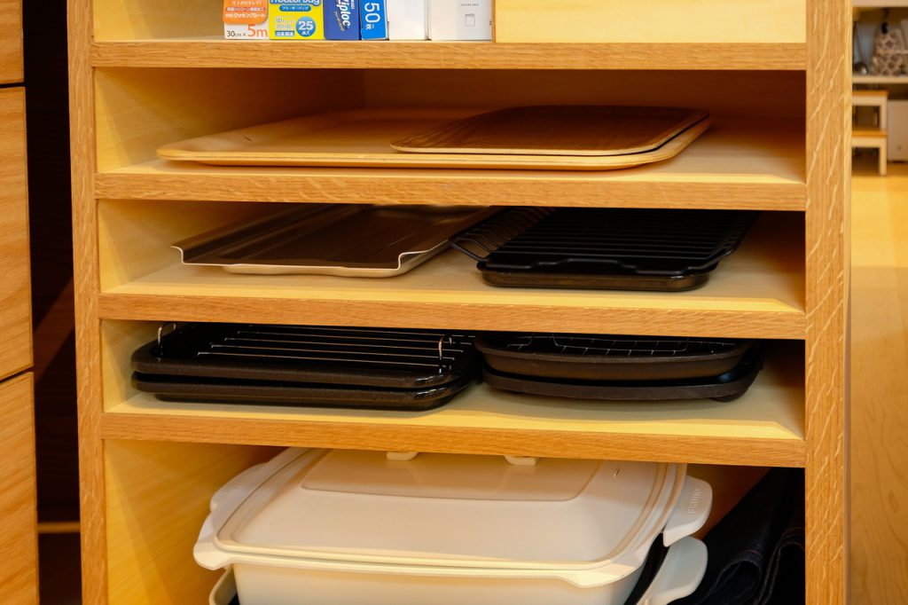 上段はどちらの空間でも使用するキッチン用品を収納し、下の段にはダイニテーブルで使用するホットプレートなどを収納しています。