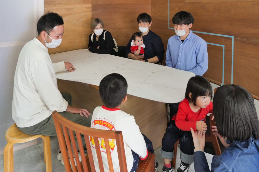 ダイニングテーブルをプラスチックダンボール板で再現し、広さや形状だけでなく、食卓を囲んだときに違和感がないかを検証しました。