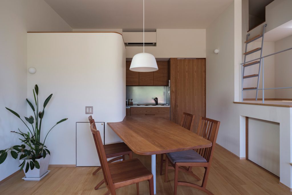 キッチン側のダイニングテーブルは、元々直角に近い形状でしたが、アール状に変更することで、座ったときに体が自然とダイニングテーブルの中心を向くように再設計しました。これにより家族の顔がより見えやすくなり、自然とコミュニケーションがとれるようになっています。