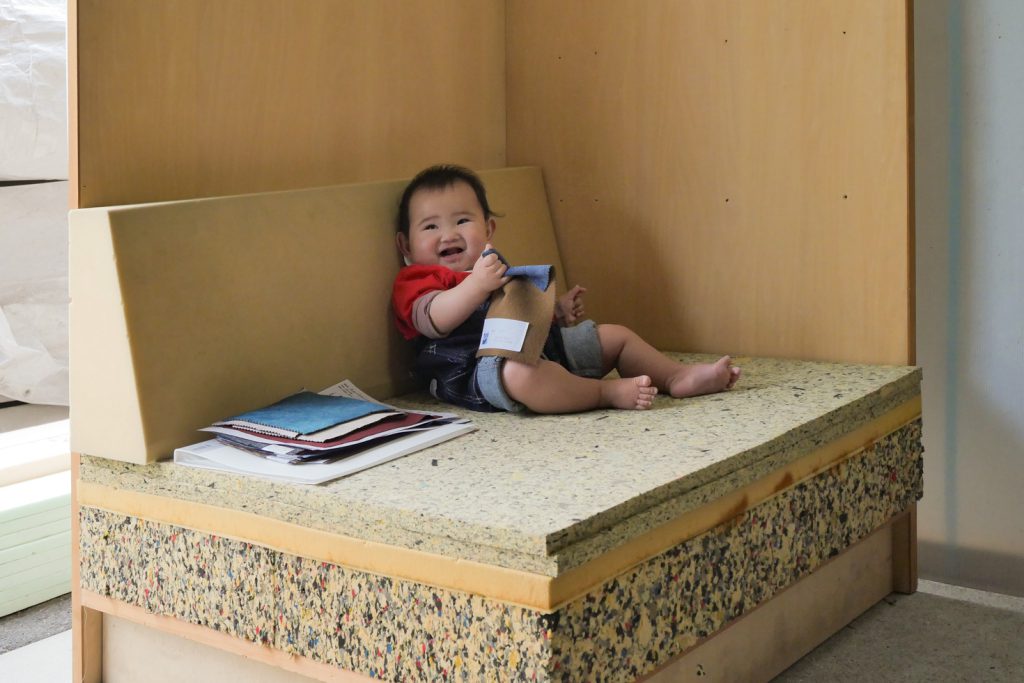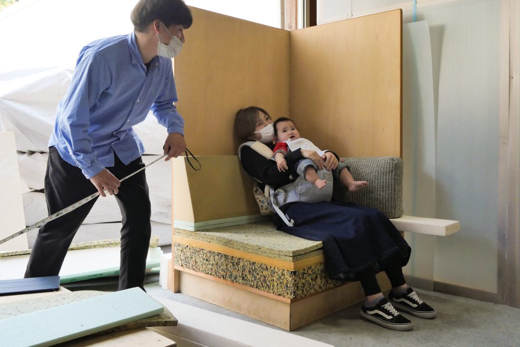 次は、造作ソファの座面の高さと奥行き・生地を決めるため、座り心地と素材の質感の検証です。