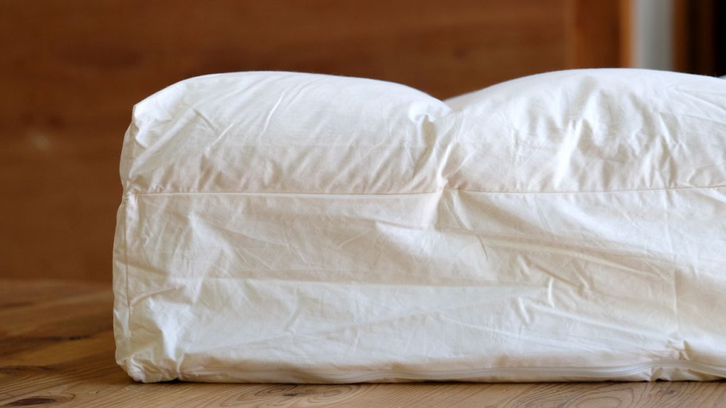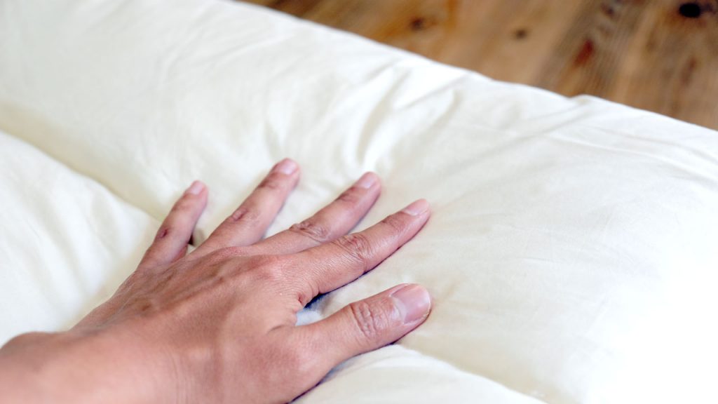 加えて、手のひらでパンパンと軽く叩いて空気を含ませると、簡単に形が復元できるのもポイント。偏りがある場合も、少しもみほぐすような感じで叩けば、整えることができます。湿発散性に富んでいてムレにくく、弾性回復率がいいのでへたりにくい素材とも言えるでしょう。