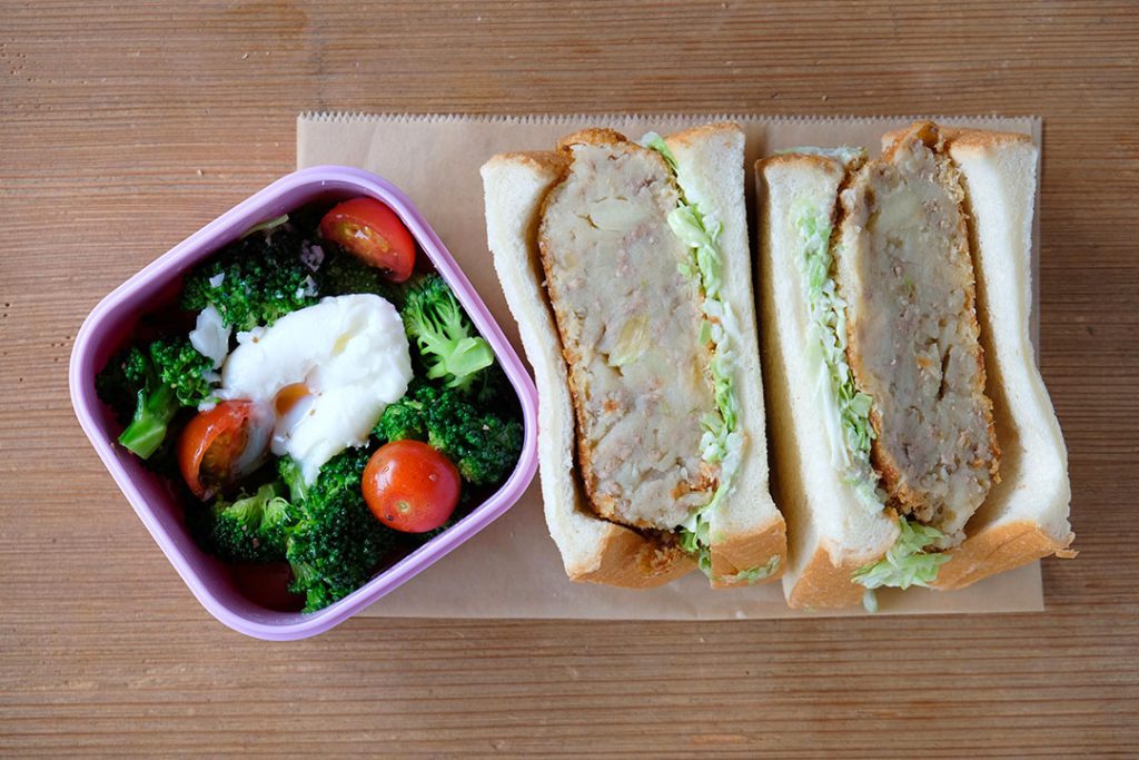 ディレクター上大川さんのお弁当は……え?どこ出身?と思ってしまいましたが、姉ちゃんがよく作ってくれたのがコロッケらしいです。めちゃめちゃ分厚い!漫画みたいなコロッケサンドですね。ちなみに鹿児島出身です。
