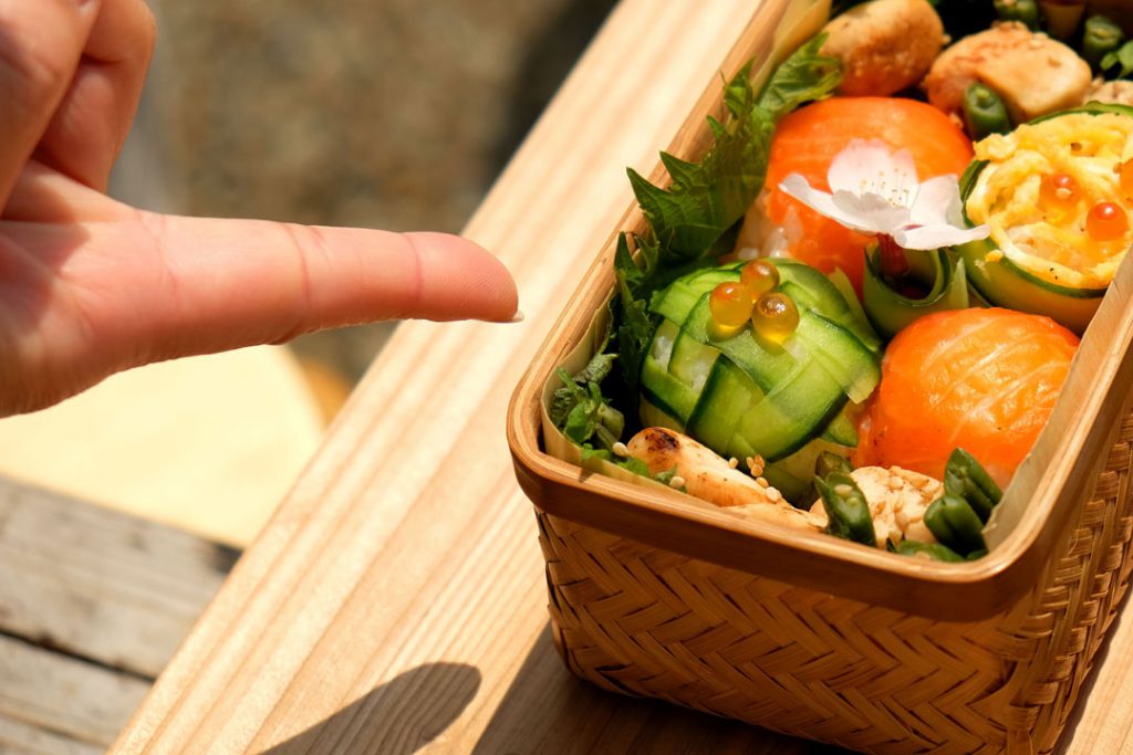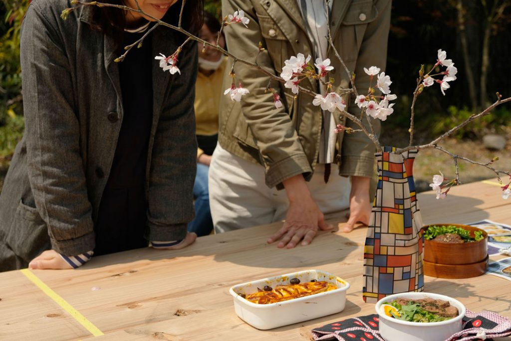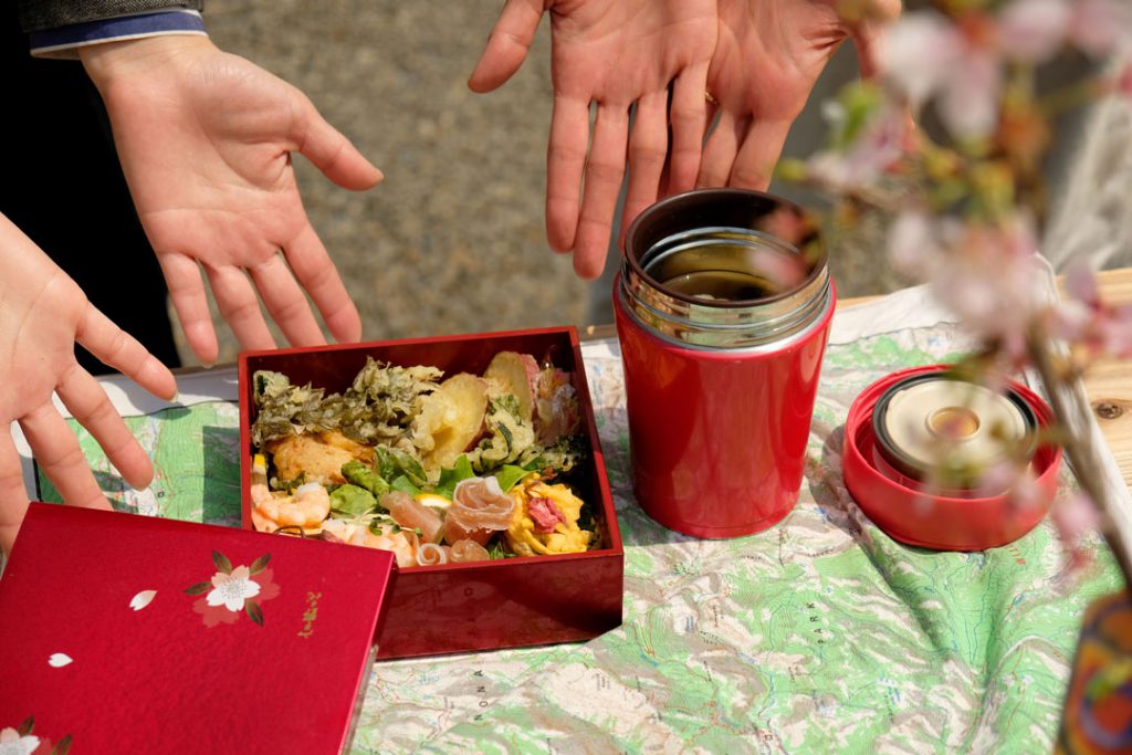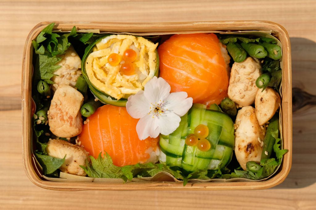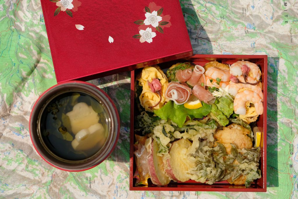 桜の和なお弁当箱に、天ぷら、お寿司、生ハムサラダ。桜の形のお麩の入ったおすましまで付いて……あ!なるほど、お花見ね!お花見意識してんのね〜。