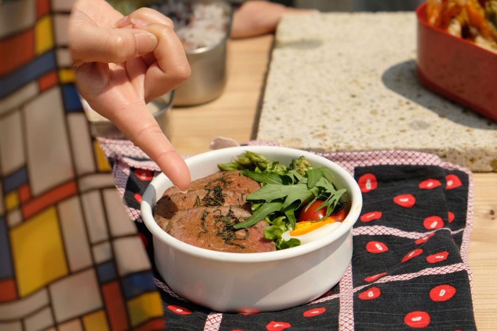 テクニカル桓本さんはローストビーフ丼!いい具合の火の通り方ですねぇ〜。屋外で、ローストビーフで、これはビールやなぁ。プシュッといきたくなりますね!