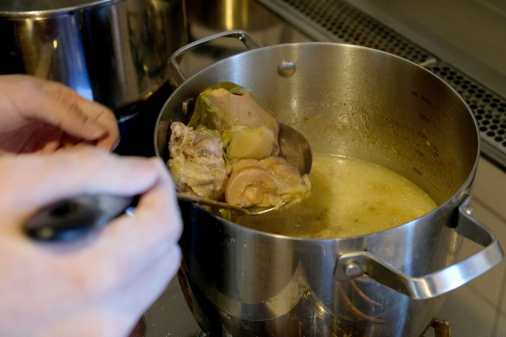 「これですよ!昨日の昼から10時間煮込んだスープで作る