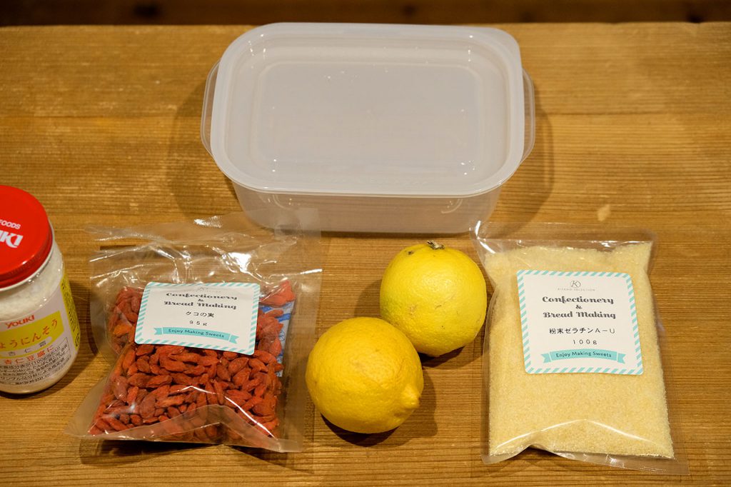 「……その他の材料はこちら!クコの実とゼラチンと……」
