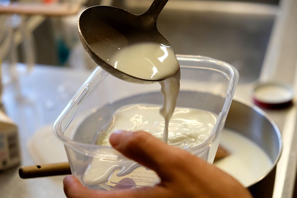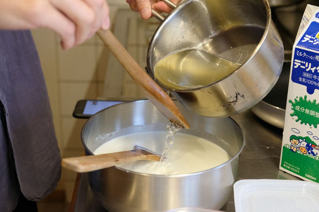 「で、ほぼ砂糖水のこれを、きょうにんそう、生ミルク、牛乳をいい具合に混ぜたものに流し込みます」
