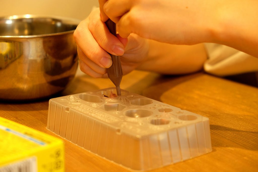 その頃、ダークサイドに堕ちたベガ弁クイーン・赤崎さんは、チョコペンで型にチョコを流し込んでおります……。