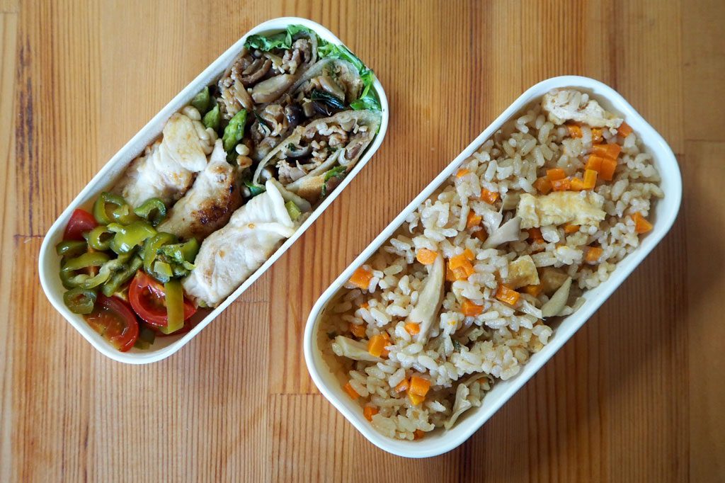 お弁当のタイトルを倒置法でキメた設計・小斎平さん。しめじがツヤツヤでなんて美味しそうな炊きこみご飯でしょうか。型抜きされた人参もいいですね、ひと工夫って大事です!
