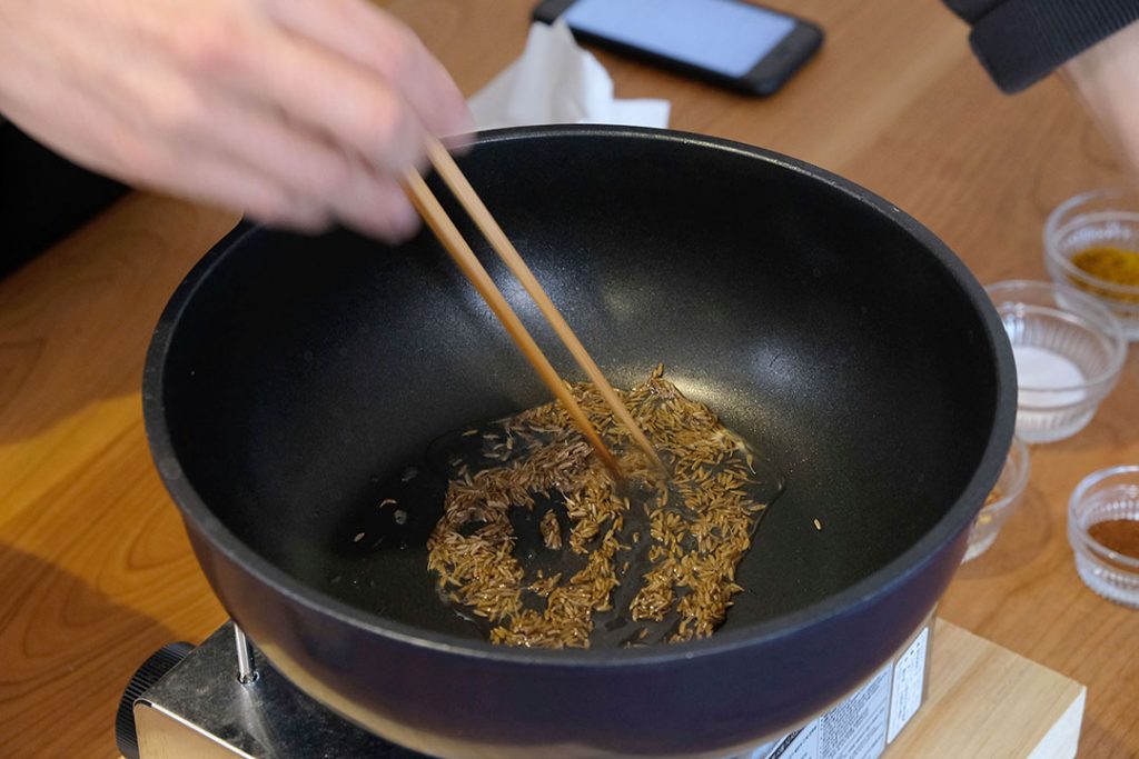 「ぇえーーー、と。……そうか。まずは油でクミンシードを炒めます