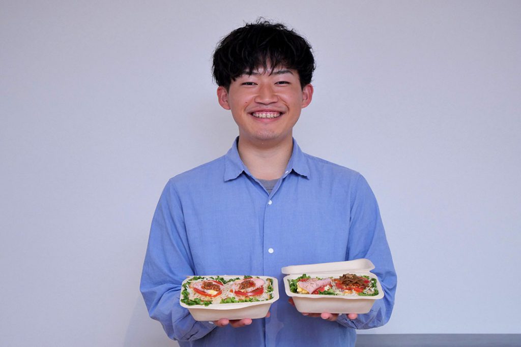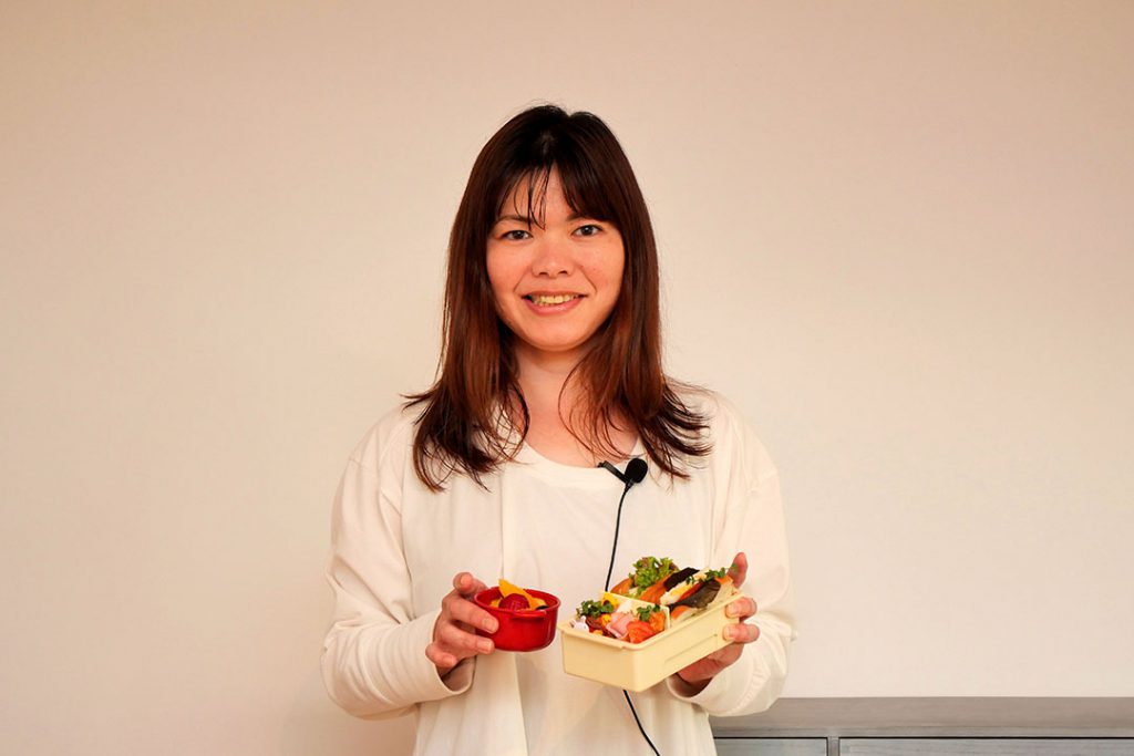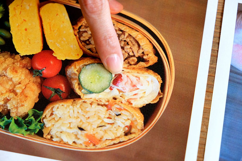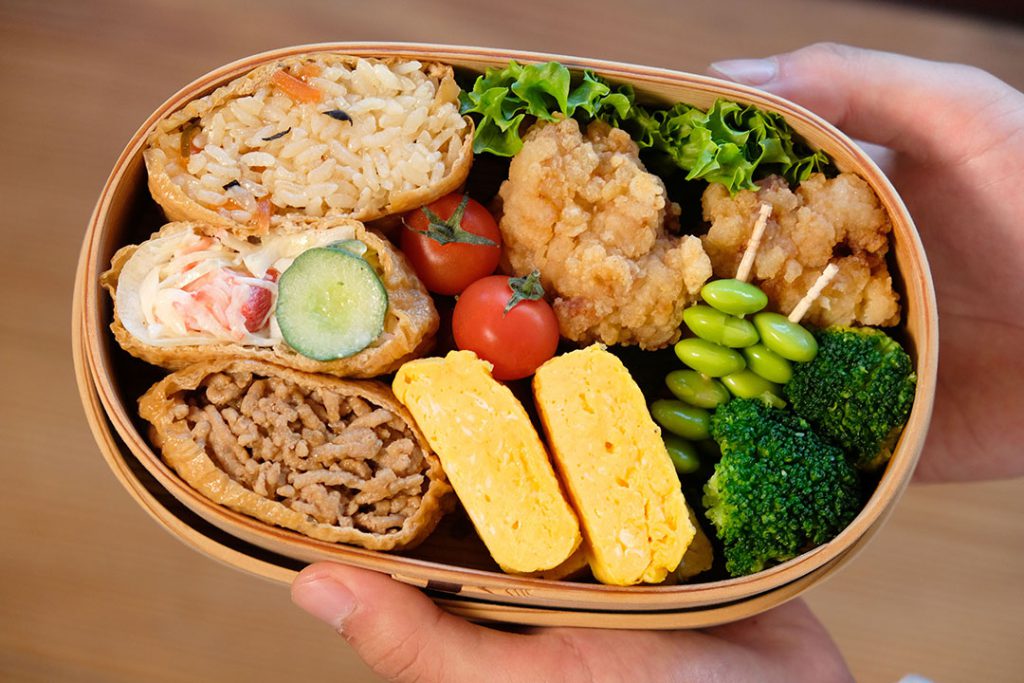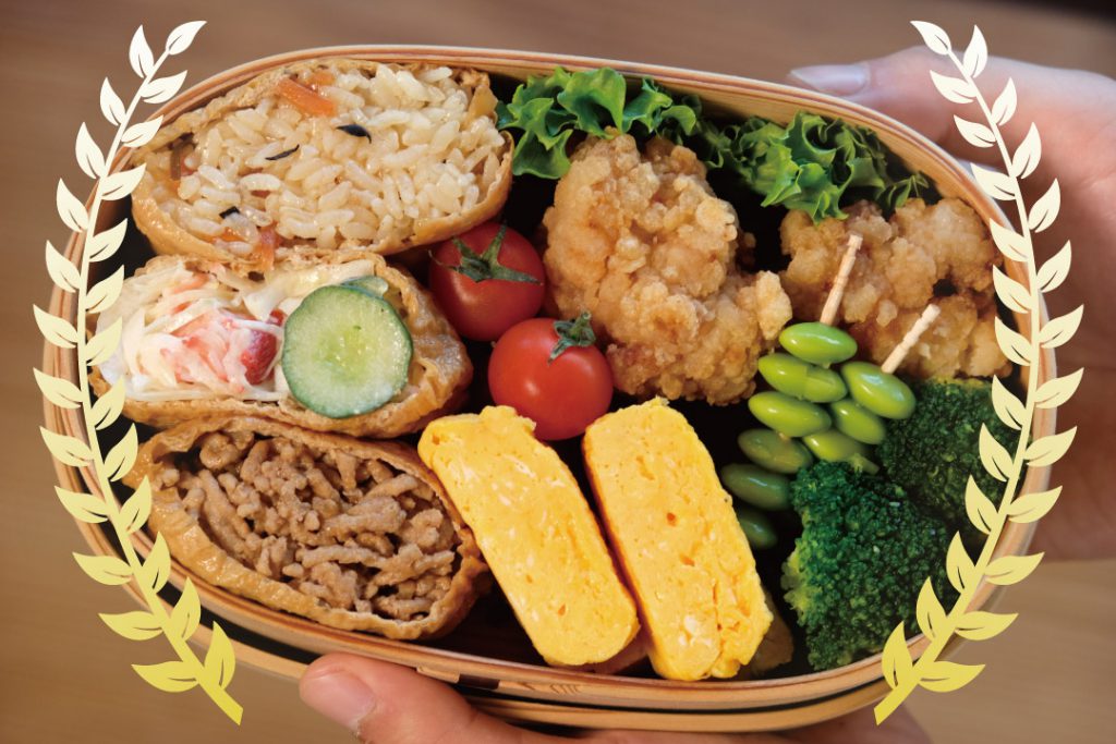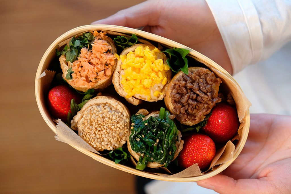 「メインはいなり寿司で、中身は五目ご飯や肉そぼろ、サラダが入っていてます」