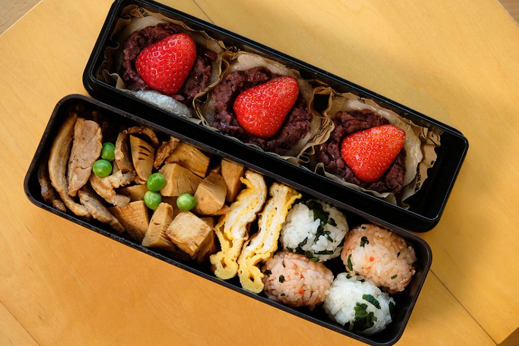 そして2段目!こちらはみんなとシェアするいちご大福です!お弁当的見栄えを意識して、あんこもいちごも見えるオープンタイプにしましたよ。