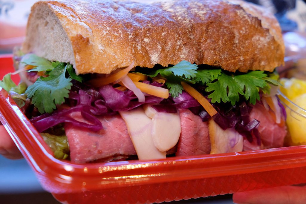 「エスニックが好きなのでバインミーを作ってきました!ローストビーフにチキン、紫キャベツ、パクチーが入っています」